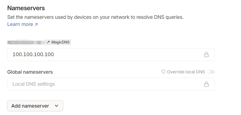 nameserver 100.100.2.138而在我们Tailscale的控制面板里面可以看到MagicDNS的IP为100.100.100.100,