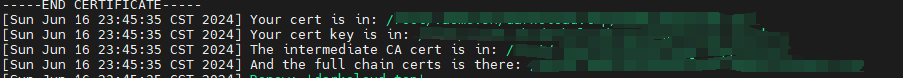 --dnssleep 30 --ocsp --keylength ec-256一切正常的话,可以去以下提示信息中找到已经签发后的SSL证书。